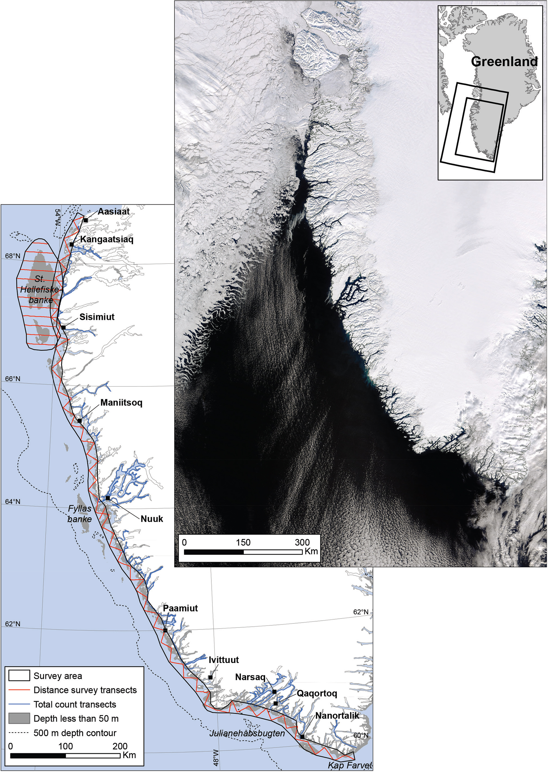 Fig. 2 (left) Aerial survey transects off south-west Greenland, covered 2–17 March 2017. Fjord areas covered with solid land-fast ice at the time of the survey are shown as white, as are terrestrial areas.