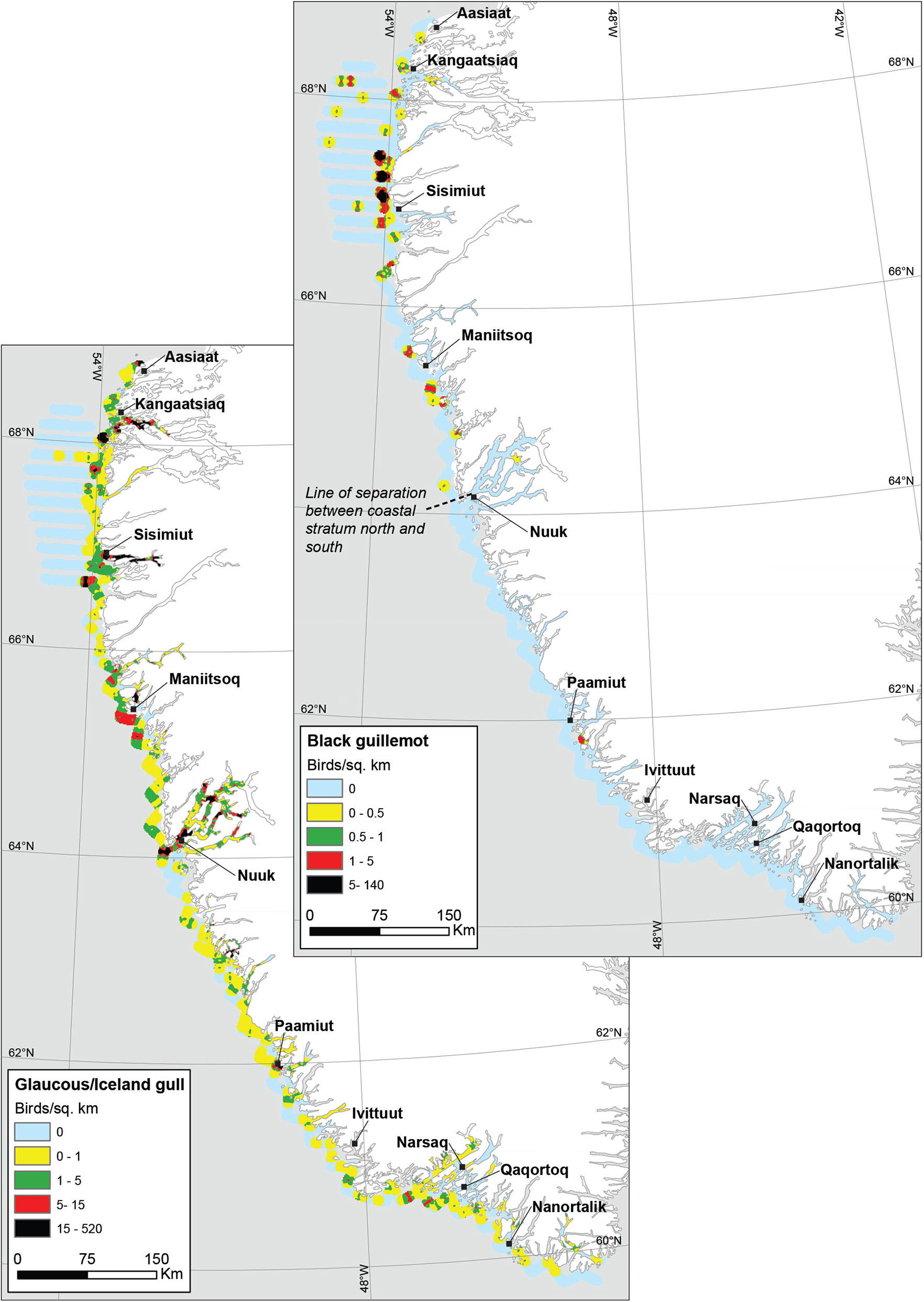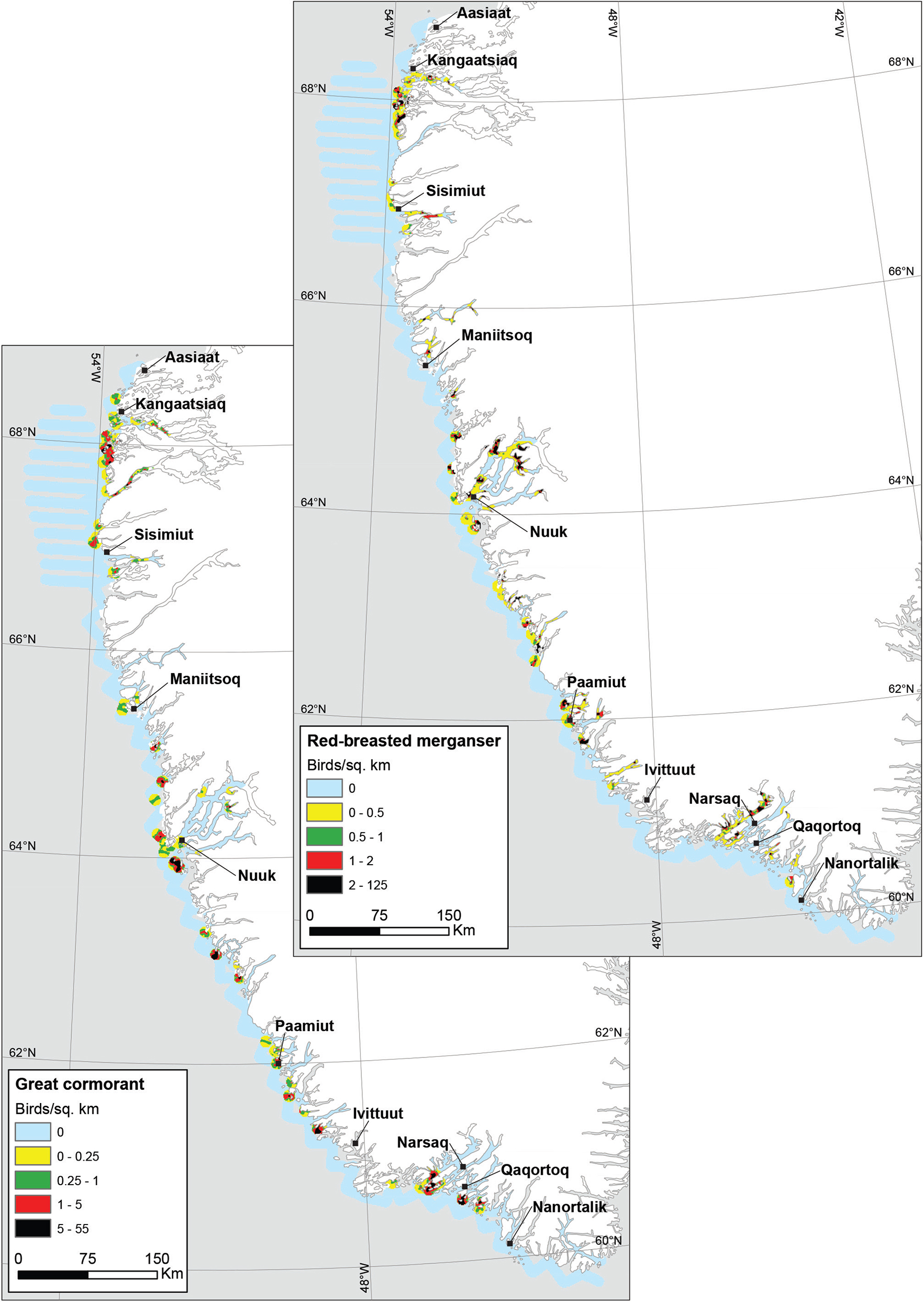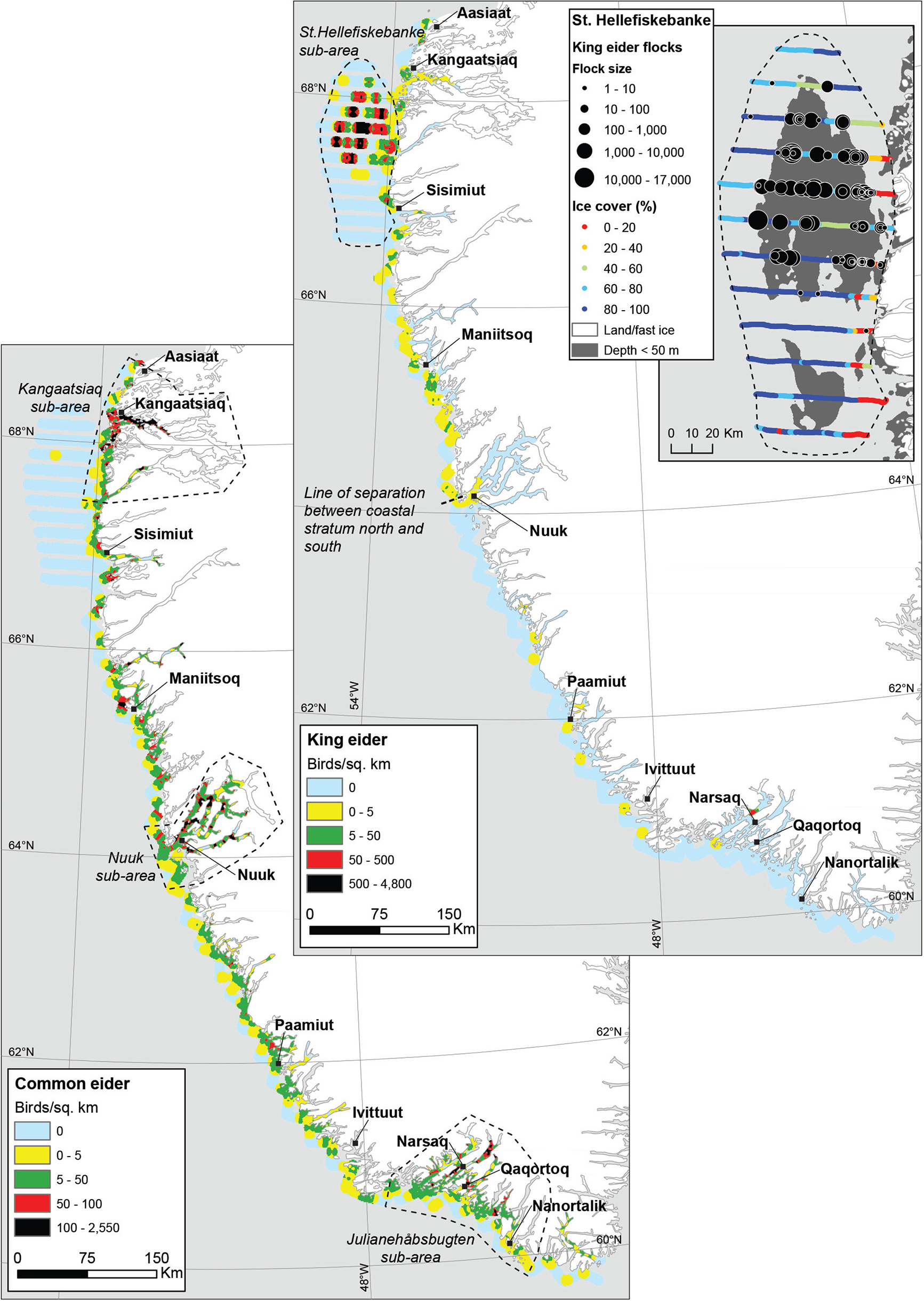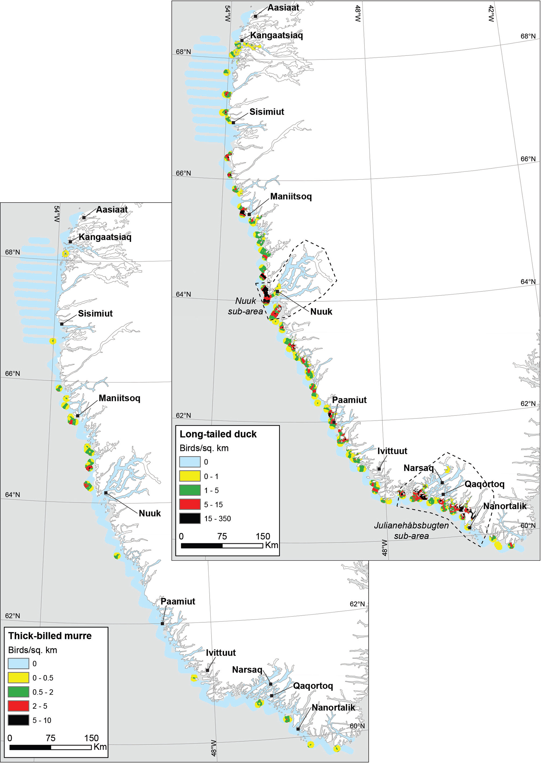 As in 1999 (Merkel et al. 2002), the coastal survey area and the adjoining fjord systems around Nuuk and Julianehåbsbugten were confirmed as key wintering sites for several species in 2017, namely common eider, long-tailed duck (only coastal), glaucous/Iceland gull (only Nuuk), mallard, red-breasted merganser and great cormorant (only coastal). For the same species, except the long-tailed duck, the Kangaatsiaq area in the north was also a key wintering site in 2017.