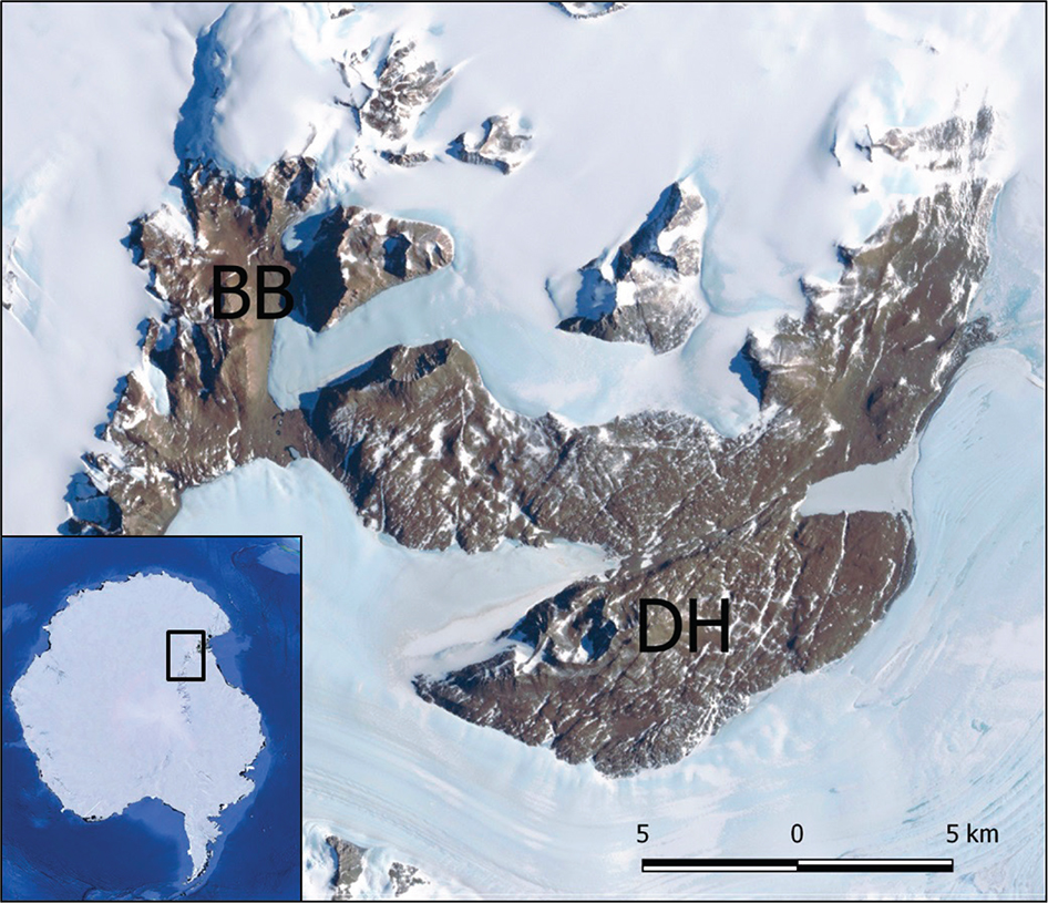 Fig. 1 The study area in Antarctica (insert), showing the locations of Bartrum Basin (BB) and Diamond Hill (DH).