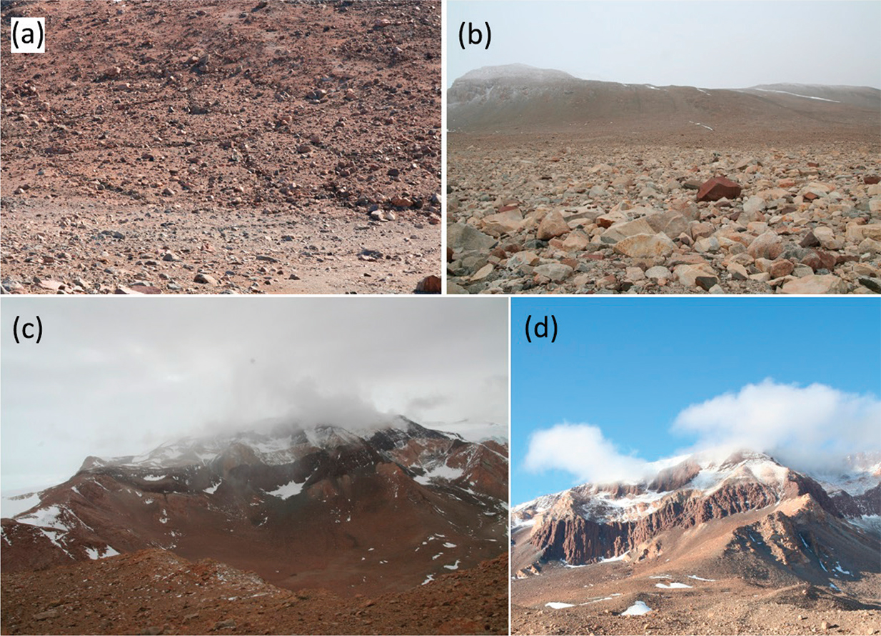 Fig. 2 (a) Soil in Diamond Hill; (b) stones in Bartrum Basin; (c, d) orographic clouds in the Darwin Glacier region.