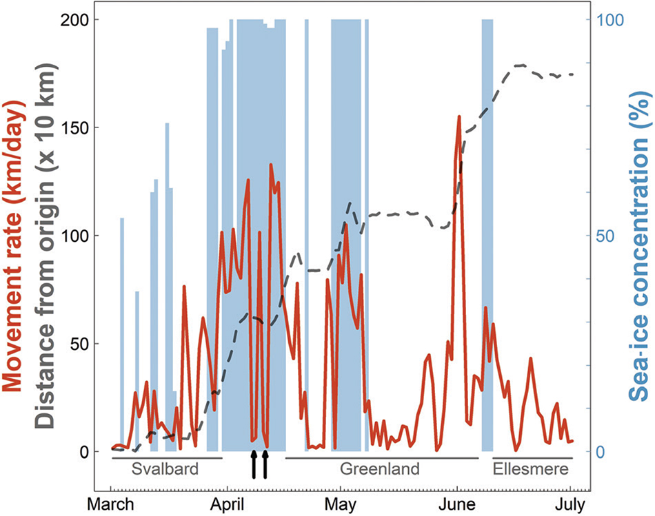 Fig. 2 Daily movement rates (red line) and straight-line distance from the point of departure (distance from origin; grey dashed line) at each location along the path of a young female Arctic fox. The blue shaded bars indicate the sea-ice concentration when the fox was travelling on sea ice. The two black arrows indicate two short stopovers (7–8 and 10–11 April) on the sea ice between Svalbard and Greenland (Fig. 1).