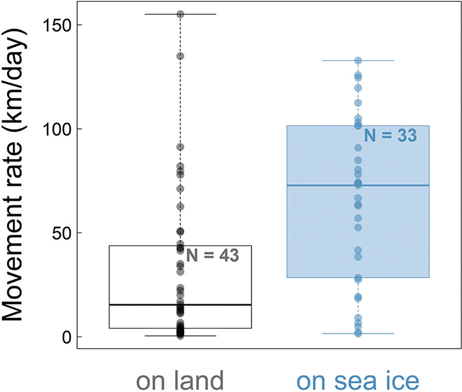 Fig. 3 Boxplot of the daily movement rates of a young female Arctic fox when on land and on sea ice. The horizontal bars represent the median, the boxes show the interquartile (25–75% percentiles) and the whiskers show the whole range. Only locations during the journey from Spitsbergen to Ellesmere Island (n = 76), between 26 March and 10 June 2018, are considered here.