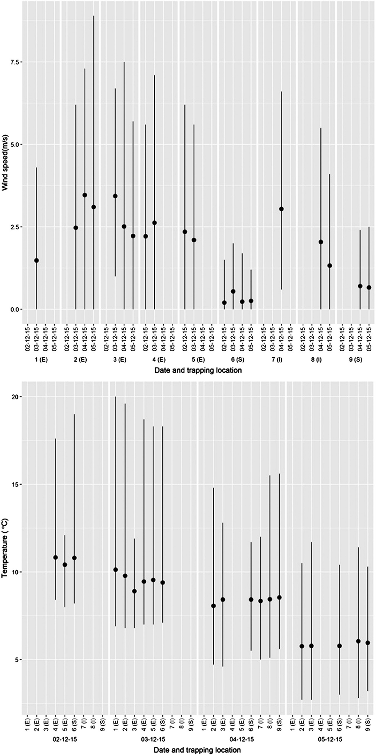 Fig. 2 Maximum, minimum and average wind speed (m/s), and temperature (°C) values for the trapping locations on Enderby Island, 2–5 December 2015. Values are based on the weather data recorded for a 24-hour period beginning at 12:00 on each day. Letters beside the trap locations indicate the exposure gradient: sheltered (S), intermediate (I) and exposed (E).