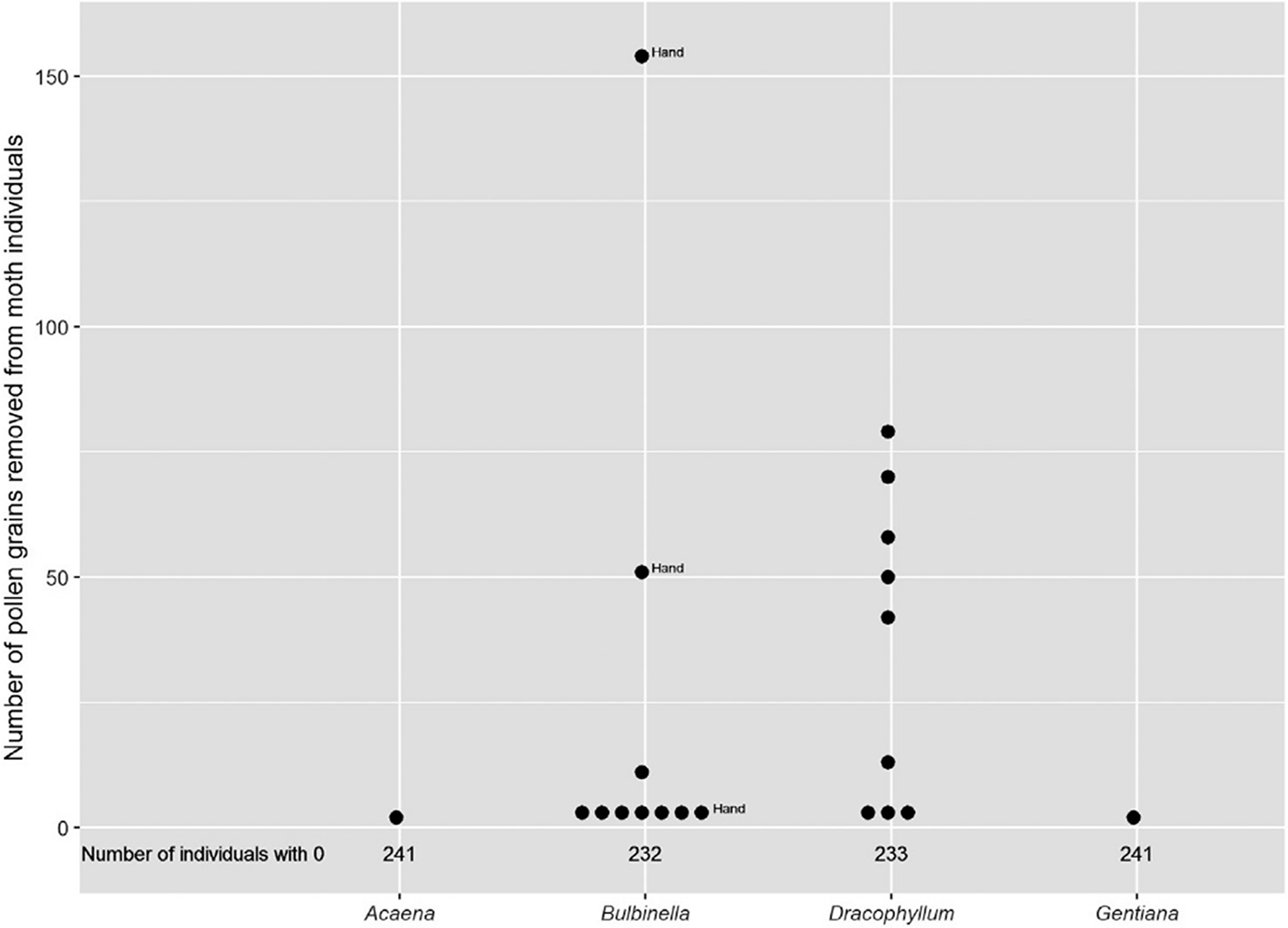 Fig. 3 Variation in the number of pollen grains removed from individual moths. “Hand” in the Bulbinella column denotes the number of pollen grains on moths caught by hand.