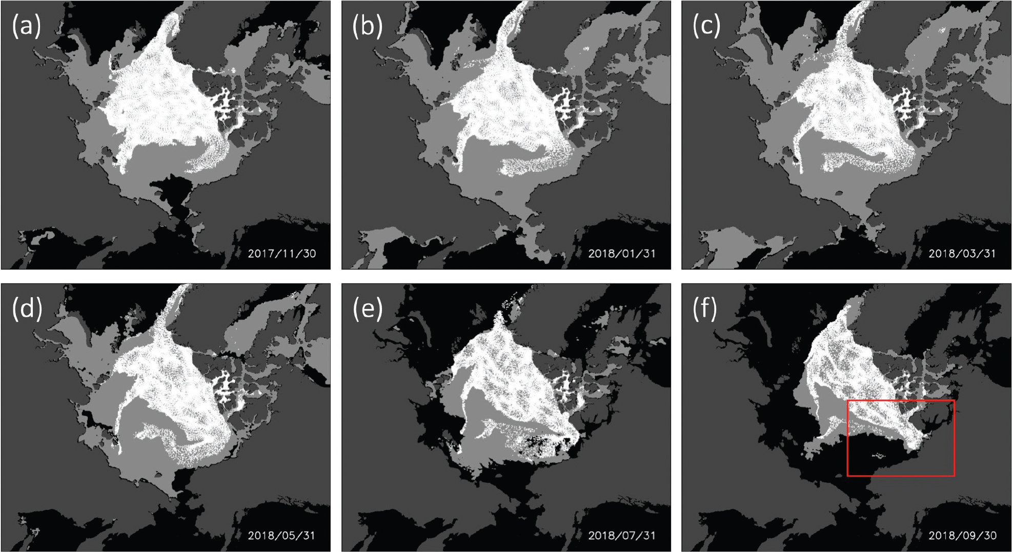 Fig. 2 Sea-ice area (grids cells with ice concentration >15%, shown in light grey) and multi-year ice distribution (white dots) derived in this study: (a) 30 November 2017, (b) 31 January 2018, (c) 31 March 2018, (d) 31 May 2018, (e) 31 July 2018 and (f) 30 September 2018 derived from AMSR-2 data (for details within red rectangle, see Fig. 3).