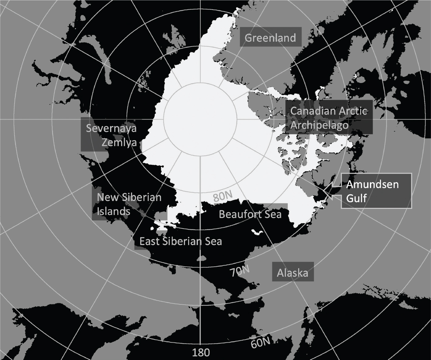 Fig. 1 Map of the Arctic region with the sea-ice area, shown in white, on 30 September 2018. Sea-ice area is defined as grids cells with ice concentration >15%.