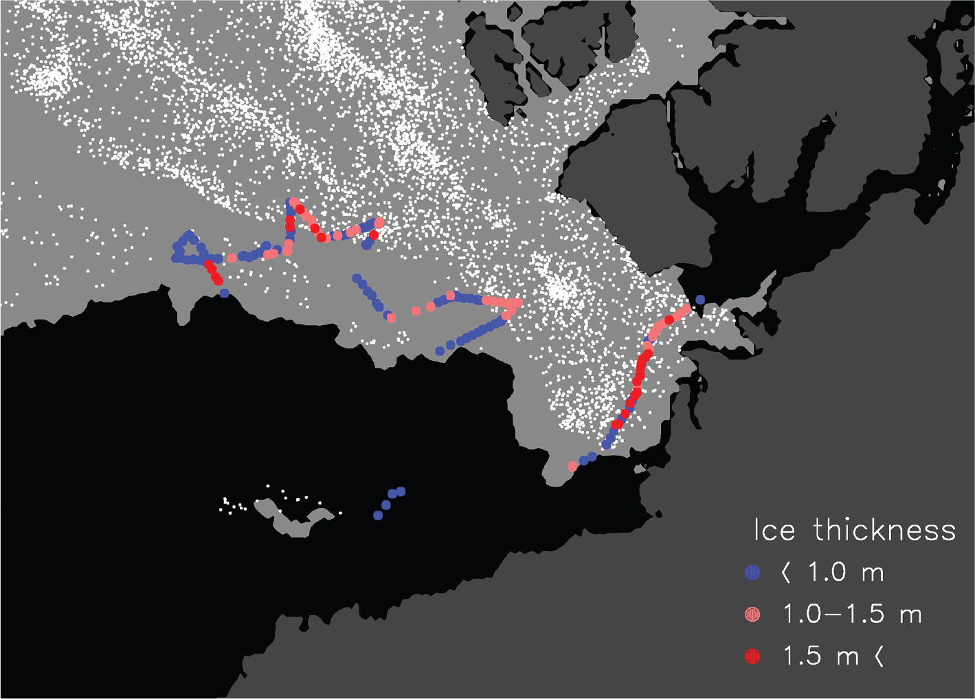 The multi-year ice distribution estimated by the particle tracking method agrees well with the observed area of thick ice (Fig. 3). This indicates that most of the ice blocking the mouth of the AG was multi-year ice with thickness >1 m.