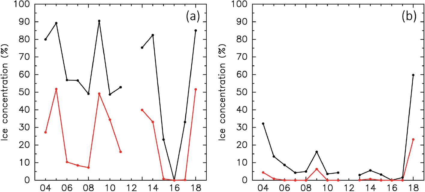 Fig. 5 Interannual variation of total ice concentration (black lines) and multi-year ice concentration (red lines) on 30 September within circles (a) A and (b) B shown in Fig. 4.