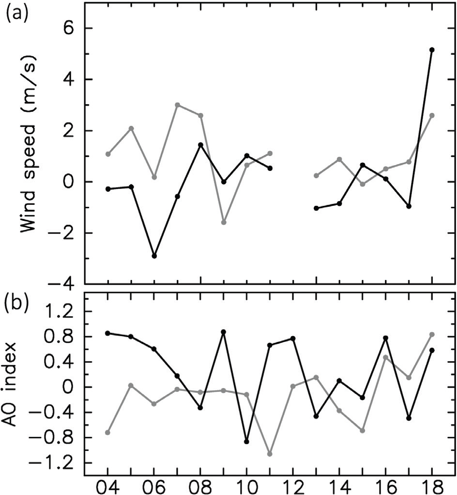 Fig. 7 (a) Inter-annual variation of monthly mean wind speed in August (grey line) and September (black line) towards right-lower direction (positive direction is shown by the bold arrow in Fig. 6a) at the centre of circle B (the black dot in Fig. 6a). (b) Inter-annual variation of AO index in August (grey line) and September (black line).
