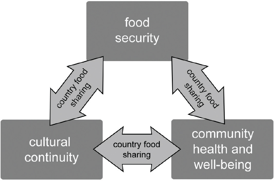 Figure 1 Theoretical model representing how food security, cultural continuity and community health and well-being are linked through the sharing of country food.