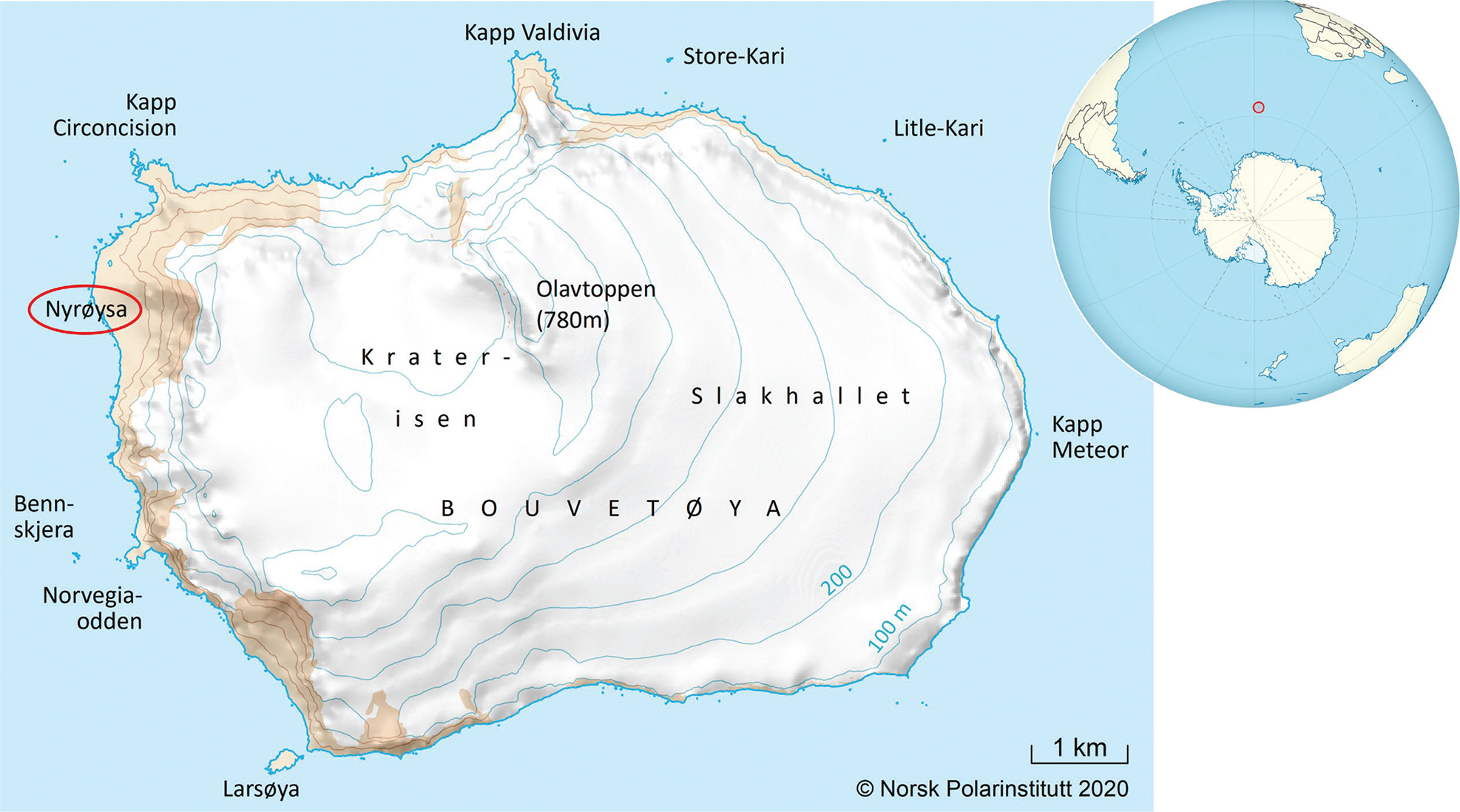 Fig. 1 Map of Bouvetøya (54°25′S, 03°22′E) and its location in the Southern Ocean (inset). Nyrøysa, the breeding ground where the animals were sampled, is highlighted on the map. (Map: Norwegian Polar Institute.)