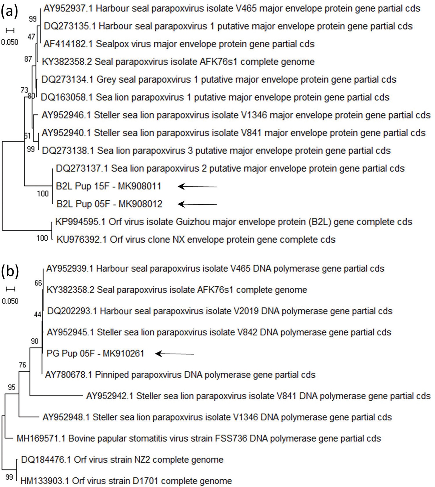 Fig. 2 (a) Phylogenetic comparison of the parapoxvirus sequences of the putative viral envelope gene B2L generated from nasal mucosal swab samples of two AFS (Arctocephalus gazella) pups, with similar sequences from NCBI. (b) Comparison of the sequences obtained from the DNA polymerase gene from one AFS pup with other parapoxvirus sequences (NCBI). The phylogenetic trees with the highest log likelihood are displayed. Numbers next to the branches are bootstrap values (1000 replicates) describing the reliability for each clade in percent.