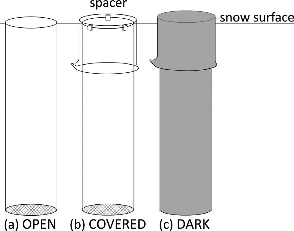 Fig. 2 The Pyrex glass tubes used for the investigation. The inner walls of the tubes were treated with PTFE. The bottoms were covered with mesh to allow air to pass through and to prevent snow from moving down. (a) In the OPEN experimental condition, the top was open and directly in contact with air. (b) In the COVERED condition, the top was covered with a Pyrex beaker and three PTFE spacers allowed air to pass through and prevented the deposition of new snow and particles. (c) The DARK condition was the same as the COVERED condition, except that the tube and beaker were covered with an aluminium sheet to prevent sunlight irradiation.