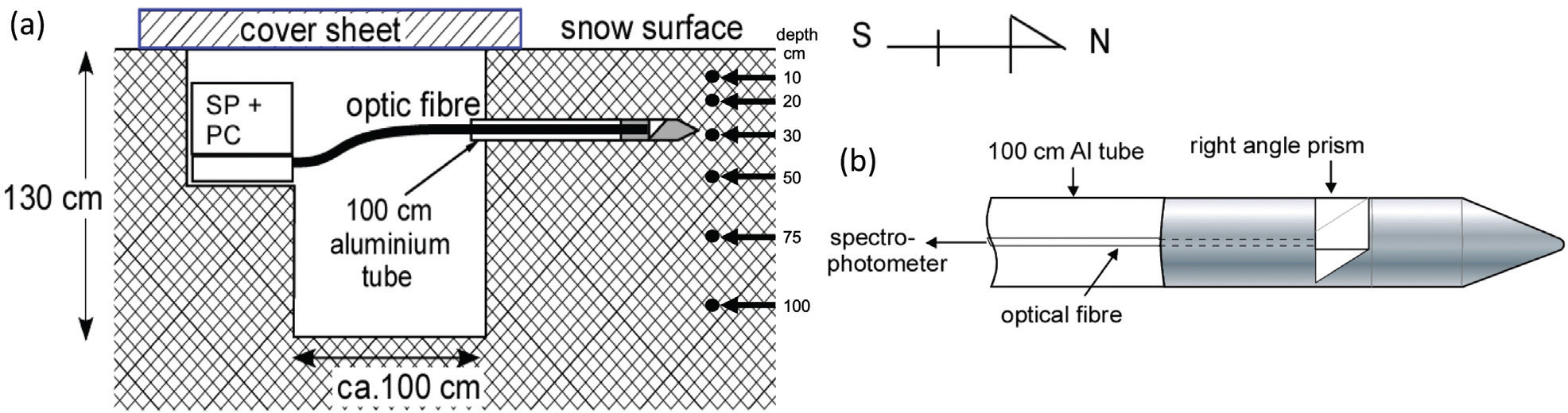 Light intensity in the snowpack was observed with a 1.3 m depth pit. An optical fibre spectrophotometer system with a UV/Vis probe (Ocean Optics TP300-UV/VIS probe and USB2000+UV-VIS-ES) was used for the observation. The tip of the probe in a right-angle prism was inserted up to approximately 90 cm from the side of the pit wall at depths of 10, 20, 30, 50, 75 and 100 cm (Fig. 3). The probe was rotated to 0° (upward in vertical direction), 45°, 90° (side), 135° and 180° (downward in vertical direction) to measure the light intensity in the snow pit from these selected directions. In addition, the reference was measured by placing the probe, which was set to 30 cm above the reflector (SRT-99-050, Labsphere), at a fixed height of 150 cm.
