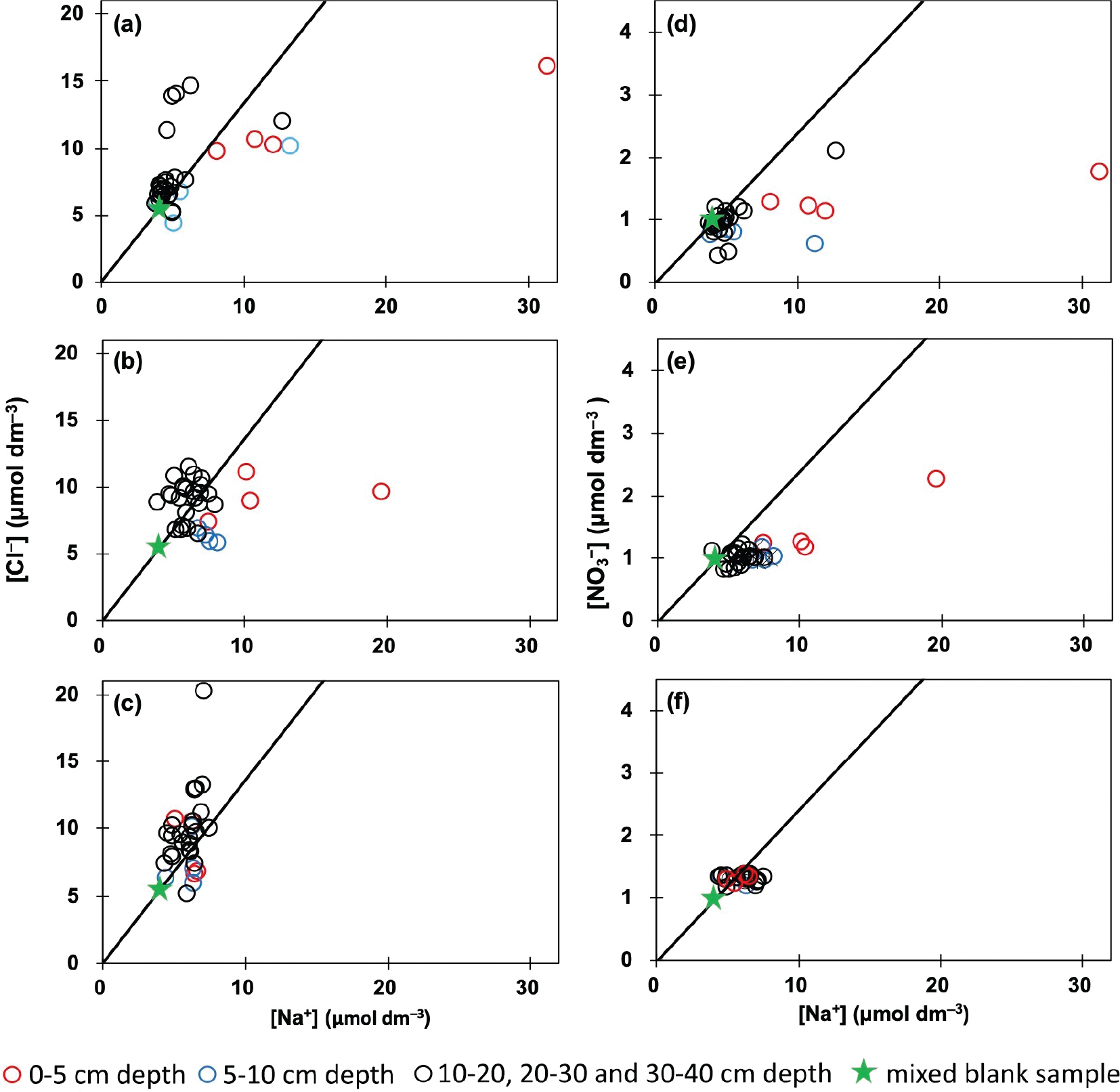 Fig. 6 [Cl−] versus [Na+] and [NO3 −] versus [Na+] in the natural samples. The slope of the line is the [Cl−]/[Na+] and [NO3 −]/[Na+] of the mixed blank sample. (a) OPEN; (b) COVERED; and (c) DARK for [Cl−] versus [Na+]. (d) OPEN; (e) COVERED; and (f) DARK for [NO3 −] versus [Na+].