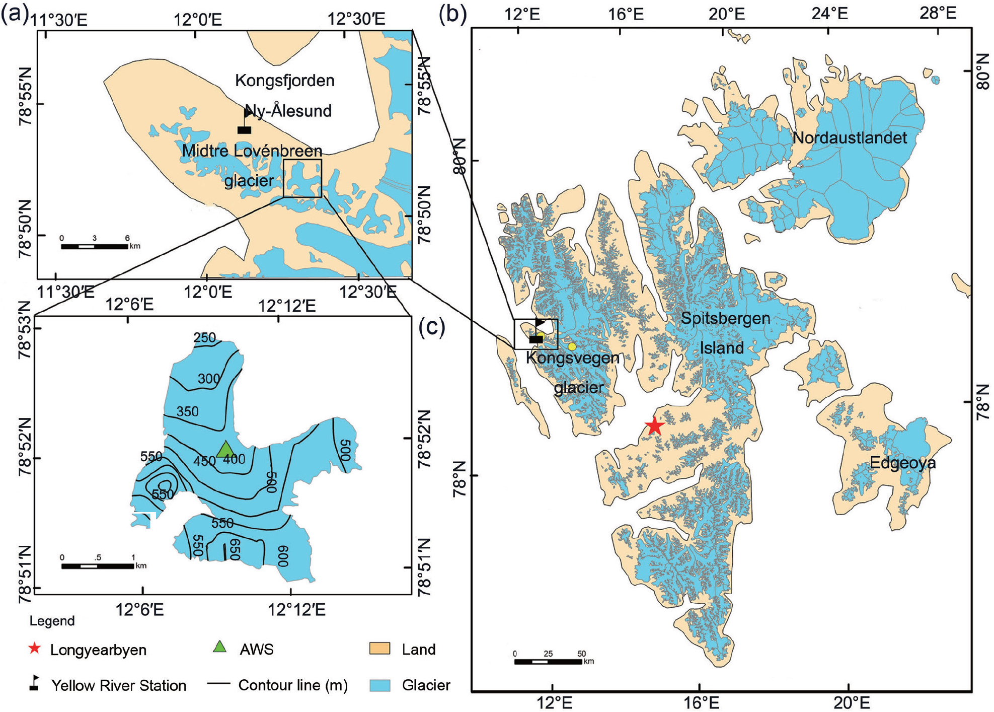 Fig. 1 (a) Location map of Austre Lovénbreen in (b) the archipelago of Svalbard. (c) The extent and contour line distribution of Austre Lovénbreen. The glacier information in the image is from the Randolph Glacier Inventory, downloaded from the World Glacier Monitoring Service.