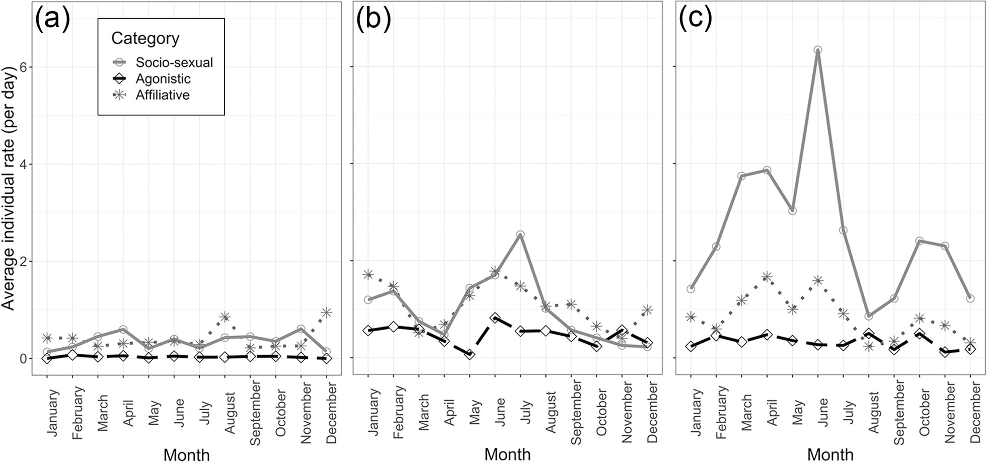 Females. Although females initiated far less social behaviour, socio-sexual behaviour similarly peaked in June (Fig. 2b, Table 8). Agonistic behaviour varied throughout the year, peaking in August. Affiliative behaviour peaked in June and August. Agonistic behaviour remained low throughout the year, with less than one bout a day, while socio-sexual behaviour and affiliative behaviour occurred more frequently.