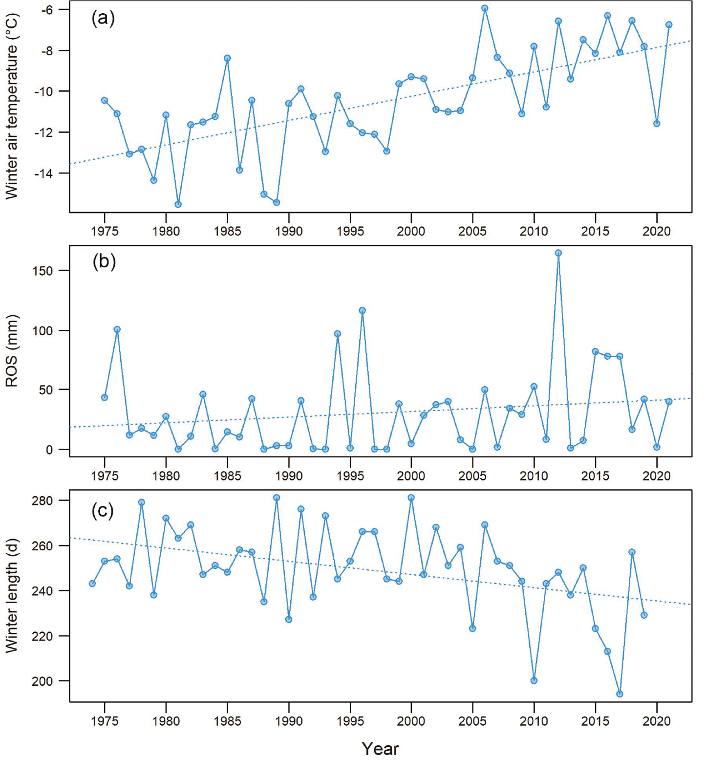 The climate of Svalbard, and particularly that of Spitsbergen, is influenced by the West Spitsbergen Current, a branch of the North Atlantic Current derived from the Gulf Stream, which delivers relatively warm water to the region’s western shores (Cottier et al. 2005; David & Krishnan 2017). Consequently, the climate of western Svalbard is typically warmer and wetter than that of other landmasses at the same latitude. Ny-Ålesund has a mean annual air temperature of -5.7 °C, and a total precipitation of 409 mm, mainly falling as snow. Mean winter and summer air temperatures (1971–2000) are -12.7 and 3.7 °C, respectively (Hanssen-Bauer et al. 2019; see also Maturilli et al. 2019). However, during recent decades, the ecosystems around Ny-Ålesund have experienced dramatic changes in climate (Hanssen-Bauer et al. 2019; Maturilli et al. 2019), with consequent impacts on ecosystems, which are described in detail below. Annual air temperature and precipitation, especially rain, have increased significantly, but with large variation across seasons (Hanssen-Bauer et al. 2019). Of particular significance are ROS events, associated with extreme warm spells in winter, which increased markedly in frequency around the turn of the millennium (Hansen, Pedersen et al. 2019; Peeters et al. 2019).