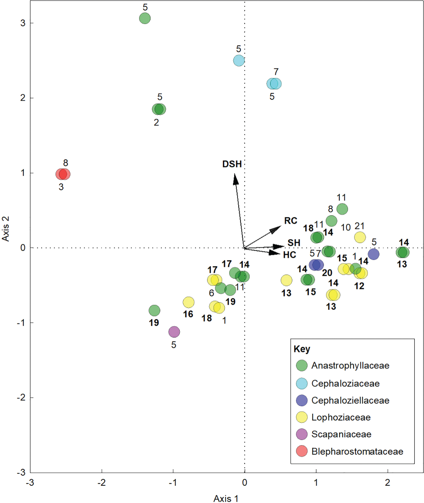 Fig. 4 PCA biplot showing associations between fungal structures and the identities of mycobionts colonizing leafy liverworts. Fungal taxa are denoted by numbers, corresponding to those in the first column of Table 2. Numbers between 12 and 20, in boldface, denote Serendipita_A–I. Arrows denote vectors: dark septate hyphae (DSH); rhizoid colonization (RC); septate hyphae (SH); hyphal coils (HC). Note that axes 1 and 2 collectively explained 83.5% of variation, and that the lack of rhizoids on the stems of Ptilidium ciliare precluded its inclusion in the PCA.