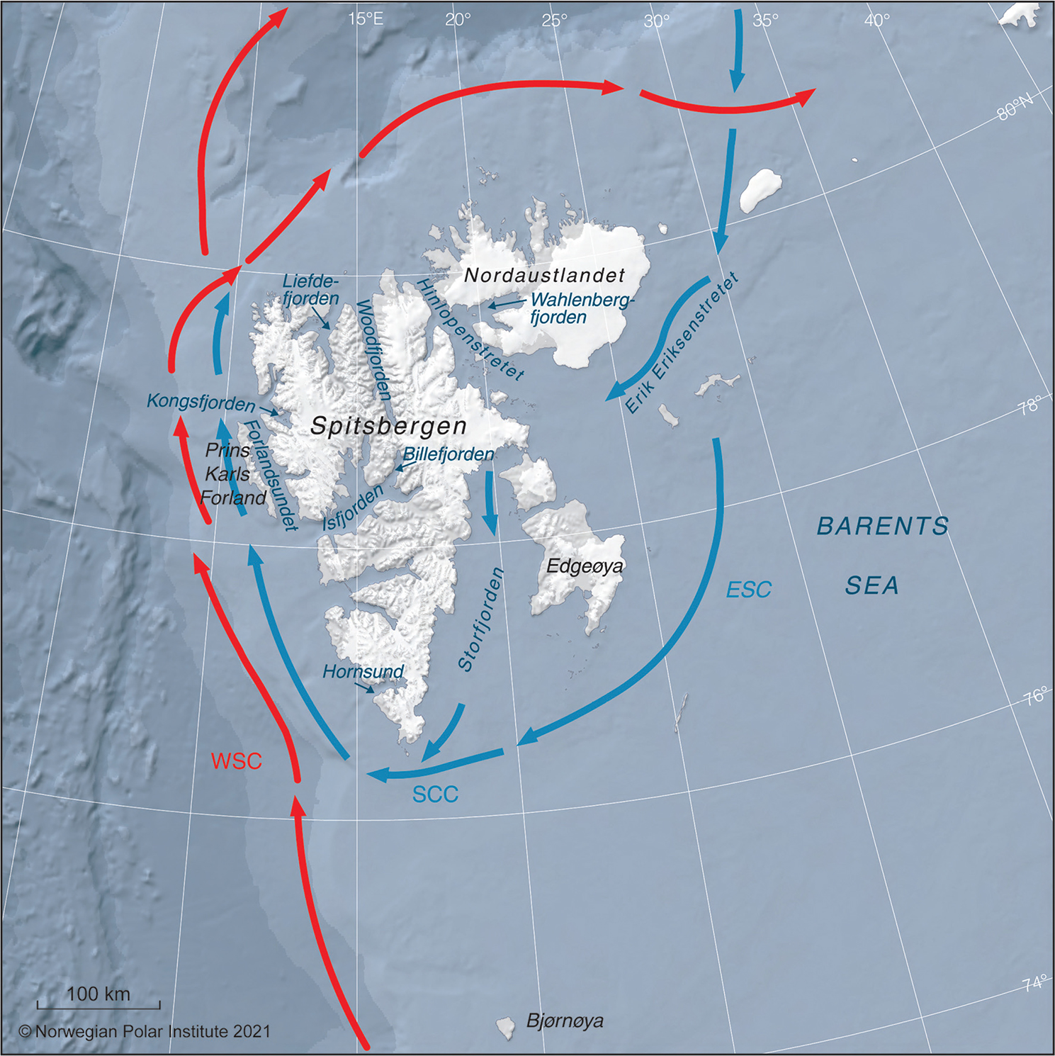 Fig. 1 Map depicting Svalbard, Norway, and surrounding Arctic (blue) and Atlantic Water (red) currents: West Spitsbergen Current (WSC); East Spitsbergen Current (ESC); South Cape Current (SCC).