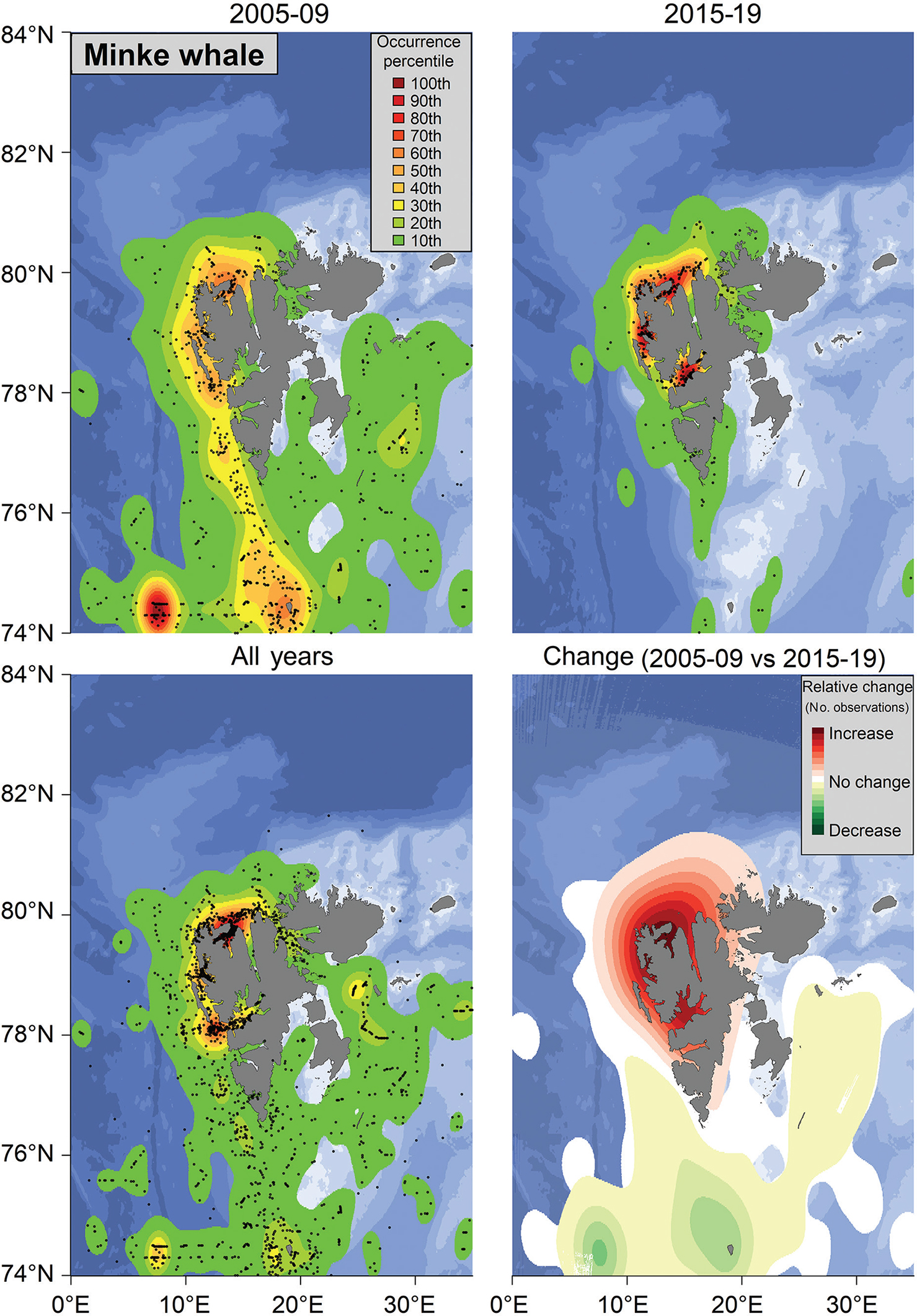Fig. 8 KDE plots showing observation frequencies of minke whales around Svalbard, Norway, during 2005–09, 2015–19 and 2005–2019 as well as the changes in observation frequency between 2005–09 and 2015–19. Black dots indicate observation locations.