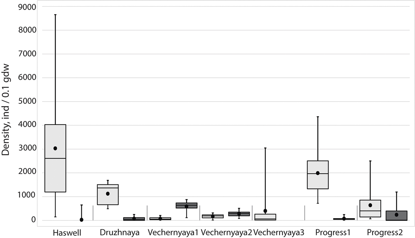 High abundances of micrometazoans were found at all the studied sites (Fig. 7). Assemblages in five of the seven sites consisted mainly of bdelloid rotifers (72.8–100% of individuals), while at Vechernyaya1 and Vechernyaya2 tardigrades predominated (88.7 and 62.0% of individuals, respectively). The sites with the highest densities (with mean and median values over 1000 ind·0.1 gdw-1) were the rotifer-dominated sites—Druzhnaya, Haswell and Progress1—where rotifer mean densities ranged from 1125 to 3030 ind·0.1 gdw-1, and the maximal value was about 8650 ind·0.1 gdw-1. The tardigrade densities at the two tardigrade-dominated sites—Vechernyaya1 and Vechernyaya2—were lower by an order of magnitude and yielded 590 and 281 ind·0.1 gdw-1, which was comparable to that of the rotifers at Vechernyaya3 and Progress2: 400 and 639 ind·0.1 gdw-1 (mean values), respectively. At Vechernyaya3, the range of values among samples at a particular site was notable: the maximum exceeded 3000 ind·0.1 gdw-1.