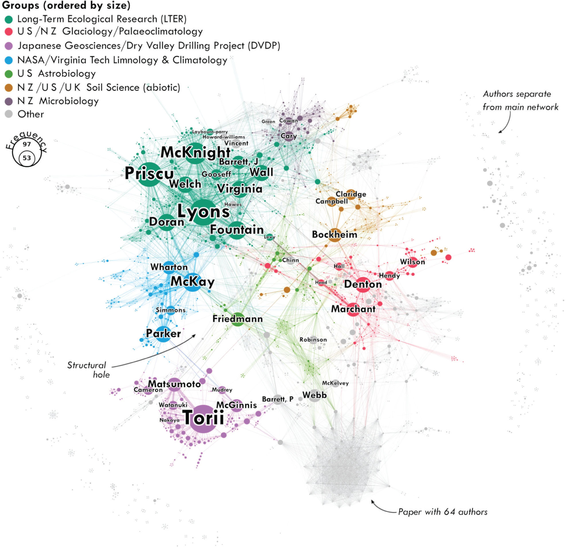 The co-authorship network comprised 3083 authors with 13 612 collaborative ties over the cumulative study period. We identified seven main research communities (hereafter, “groups”) based on the modularity analysis, many of which approximate real-world research projects, academic institutions or national programmes (Fig. 3). One of the more conspicuous (yet unlabelled) groups represents the community formed through a single article with 64 authors (Wilson et al. 2012). The gaps between groups represent areas of weak connection, or ‘structural holes,’ in the network (Burt 2004, 2009). In this conception, researchers on either side of a structural hole tend to think and publish in different flows of information, which, in turn, creates a competitive advantage for individuals whose relations span those holes (Burt 2004, 2017). Indeed, in the MDV, we see several scientists acting as bridges across structural holes by forming collaborative ties that connect different parts of the network. For example, Joe Levy, who studies the geomorphic and hydrologic effects of melting permafrost, connects the glaciologists in the MDV LTER with the palaeoclimatology group. E. Imre Friedmann, an expert on cryptoendoliths (organisms living in rocks), is located between the limnologists and planetary geologists. Other scientists lie outside the main network, representing individuals with no collaborative ties to the primary research groups (‘isolates,’ in network terminology).