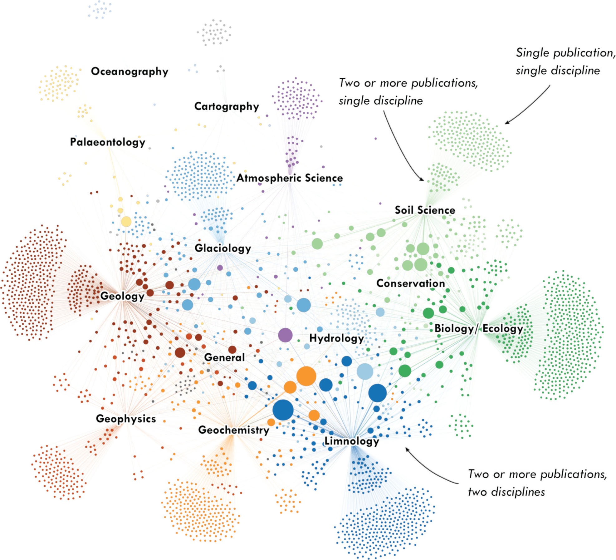 Cumulatively, geology was the most published discipline (602), followed by limnology (419) and biology/ecology (416). The spatial arrangement of the author–discipline network shows a variety of local-scale relations nested within the macro-level network structure (Fig. 5). At the coarsest level, a clear distinction exists between abiotic and biotic disciplines, which occupy the left and right sides of the network, respectively. These are connected by the disciplines of hydrology and general studies, located near the centre. Other disciplines have stronger connections within the biotic or abiotic halves, such as conservation, which sits among the biotic disciplines but has relatively little connection to geology or geophysics. The disciplines of oceanography, palaeontology and cartography are less prominent and lie on the periphery of the network. At the finer scale, the vast majority of discipline-specific scientists lie on the periphery of the network, having published only one or two publications. Meanwhile, scientists who have co-authored papers in multiple disciplines (more than two ties) are located near the centre. Interestingly, this interdisciplinary space contains nearly all the most published scientists in the network. The exceptions are the disciplines of hydrology and general studies, which are so interdisciplinary that they pull their less-published scientists into the centre.