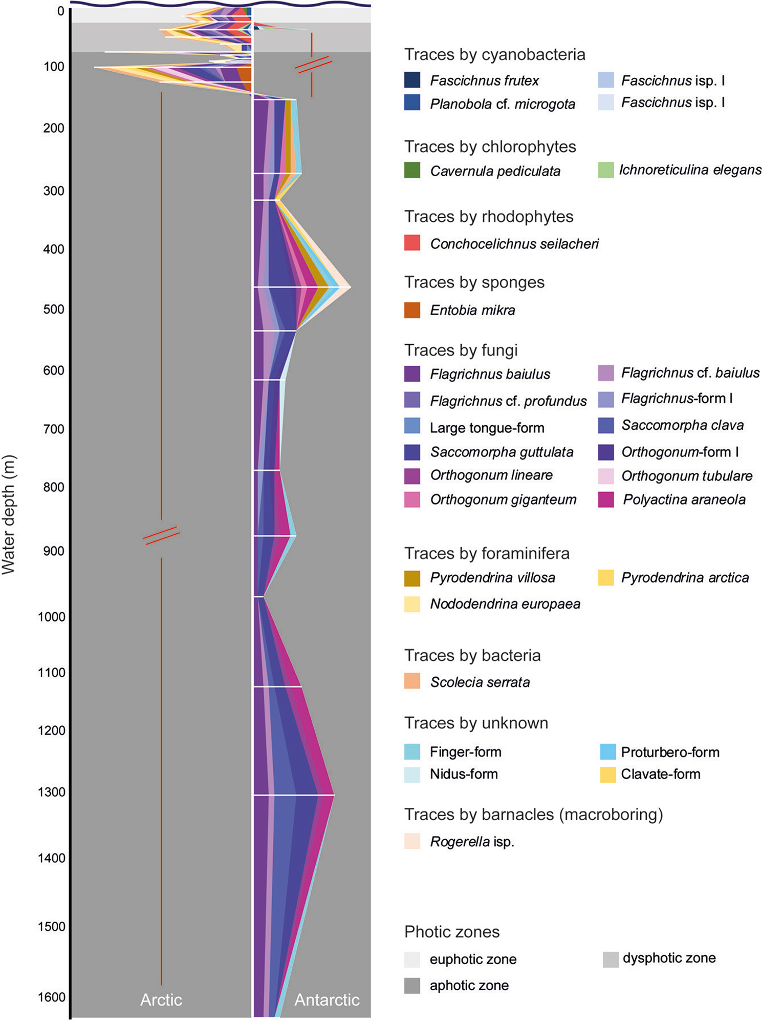 The dysphotic zone was originally characterized by Ichnoreticulina elegans and Saccomorpha clava, but S. clava was absent or very rare in our study sites and is hence considered unsuitable for the polar realms. Instead, Conchocelichnus seilacheri is suggested to complement the cosmopolitan I. elegans. Both ichnotaxa are bioeroded by phototrophs well adapted to low-light conditions. It must be stressed, however, that the index ichnocoenoses alone does not allow an unambiguous interpretation, and it is essential to assure the absence of other traces by phototrophic euendoliths (except for the rare cyanobacterium Plectonema terebrans and its trace Scolecia filosa) in the dysphotic zone.